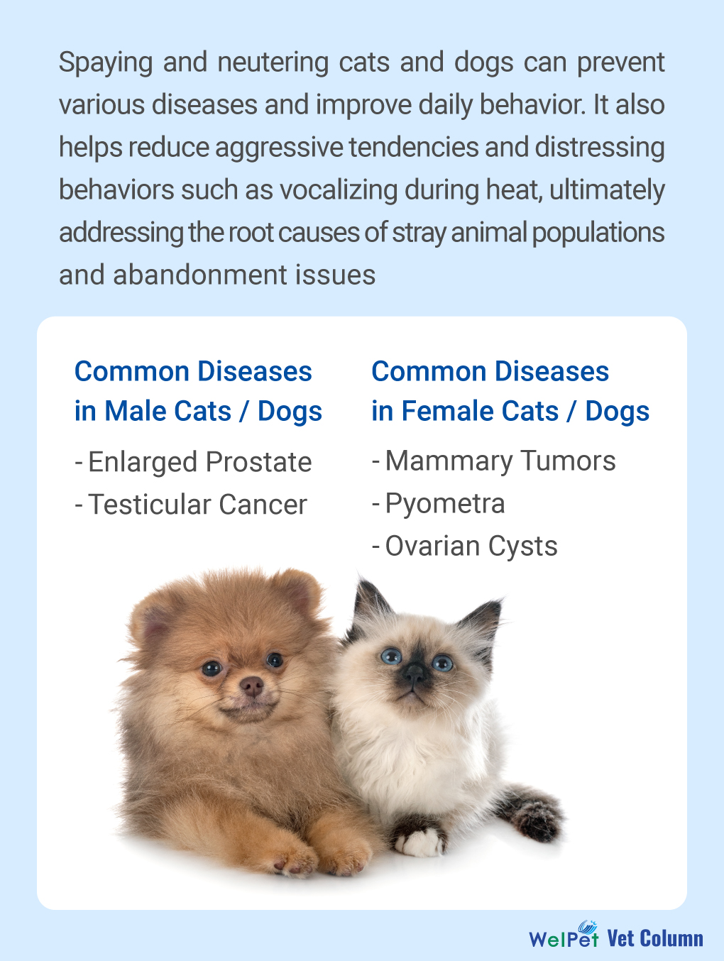 For females, spaying lowers the risk of pyometra and mammary tumors; for males, neutering prevents testicular cancer and reduces prostate problems.