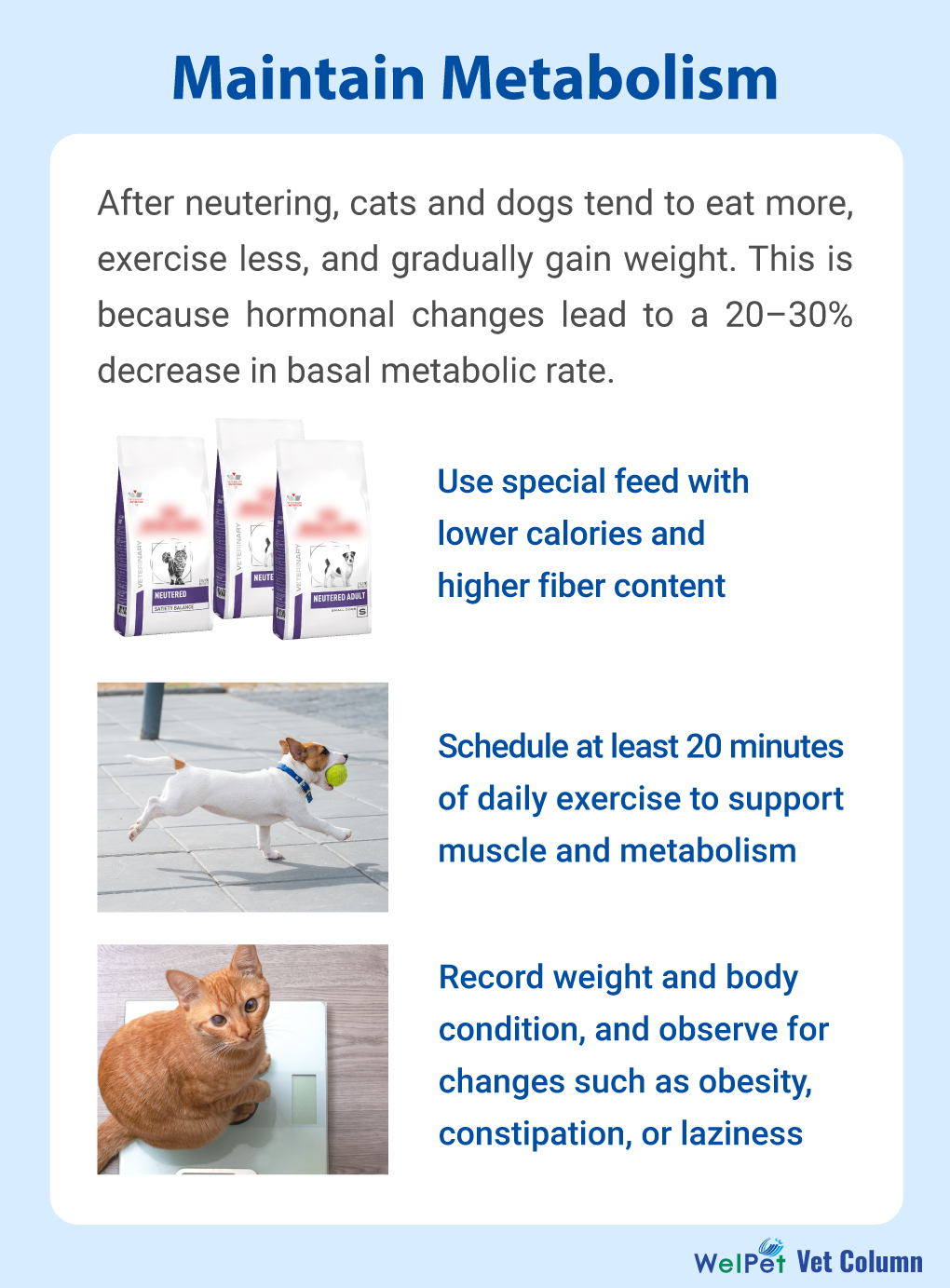 After a spay or neuter, many pets tend to eat more, move less, and gain weight.