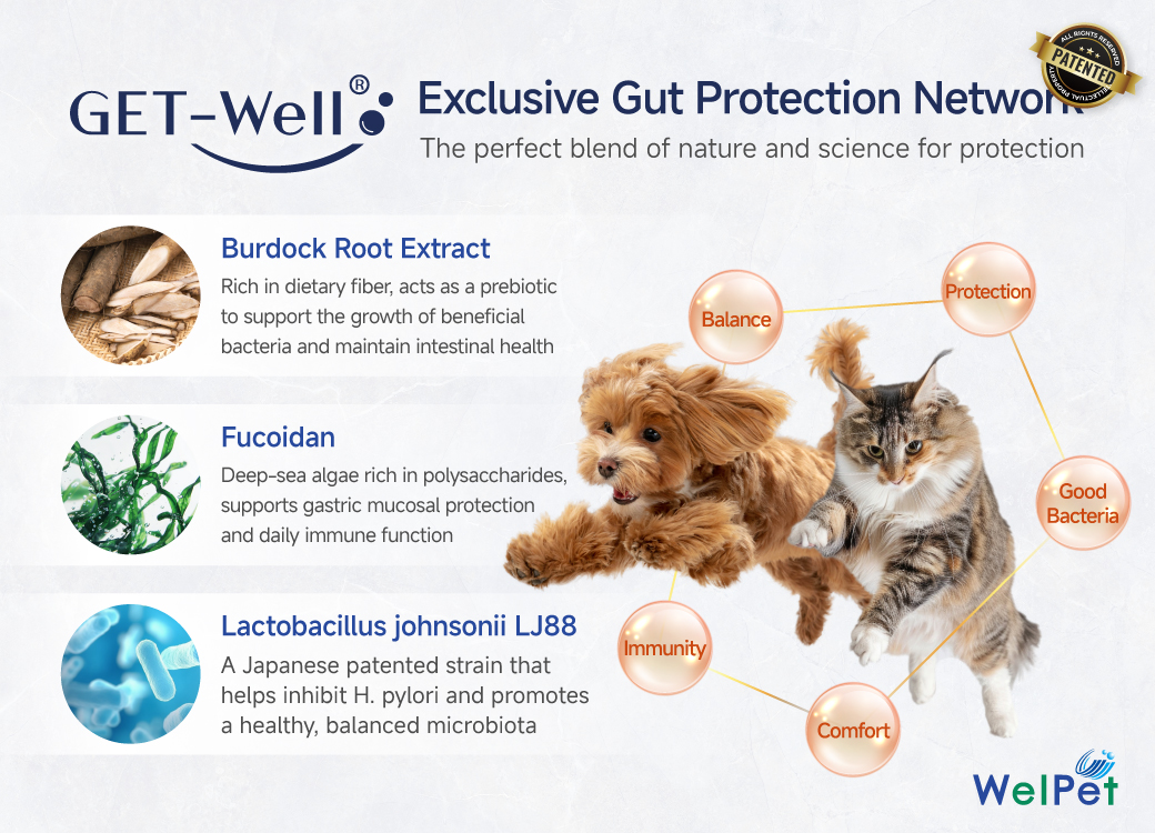 A healthy gut is the foundation of your pet’s overall wellness. GET-Well® features a clinically balanced blend of patented probiotic LJ88®, burdock root, and fucoidan, working together to deliver triple-action benefits: gut balance × beneficial bacteria support × mucosal protection.This unique formula not only supports everyday digestive health for dogs & cats but also provides extra care during periods of digestive sensitivity, helping your pet maintain a stable, comfortable, and healthy gut.