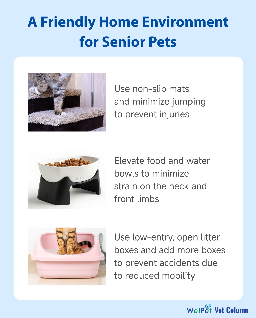 Accessibility: Provide low-entry, open litter boxes and place multiple boxes throughout the home to accommodate reduced mobility and help prevent accidents