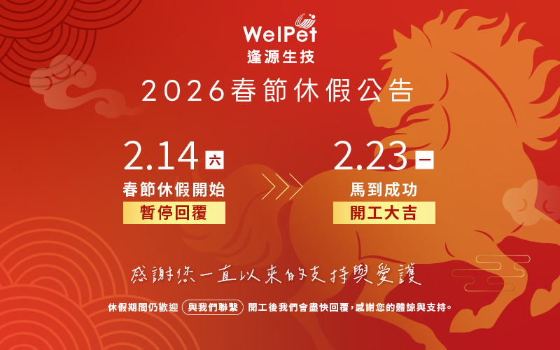 逢源生技全體於2026年2月14日展開農曆新年假期,2月23日恢復上班,新年假期期間仍可於官網與聯繫我們,我們會在上班日盡快回覆您,預祝大家有個美好的新年假期。 新的一年也將繼續在寵物健康領域耕耘開發,提供各位優質產品與創新技術,與您一起在寵物保健食品市場馳騁疆場、打造一馬當先的好產品!