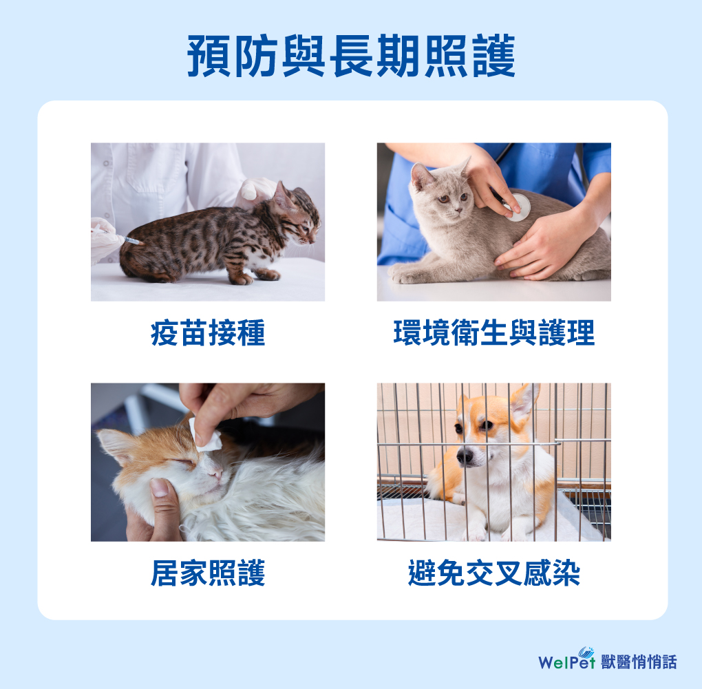 - 疫苗接種:按時給毛孩接種核心疫苗。犬隻應接種含犬瘟熱在內的疫苗,降低病毒性結膜炎風險;貓咪應完成含貓皰疹、卡里西病毒等成分的疫苗接種。