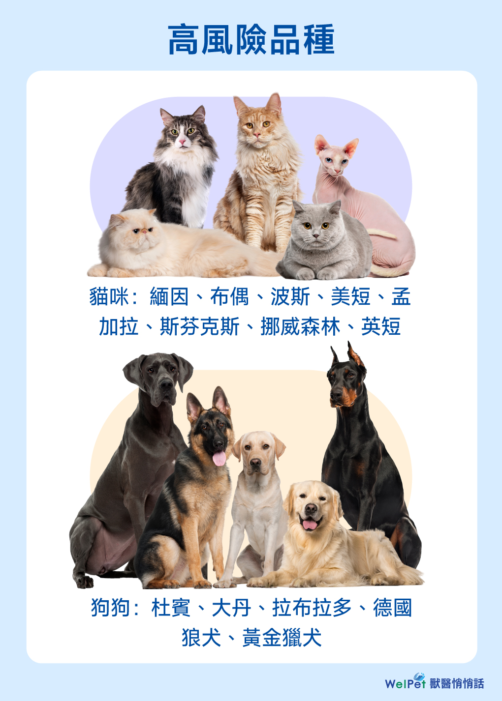 高風險品種常見於杜賓、大丹、德國狼犬、黃金獵犬與拉布拉多。
