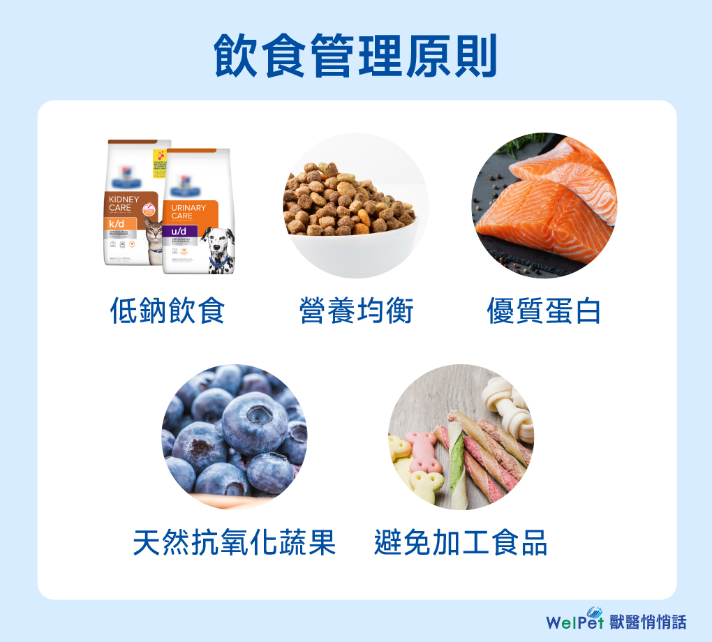 低鈉飲食:選擇標示低鹽的處方飼料,能減少水腫與心臟壓力。