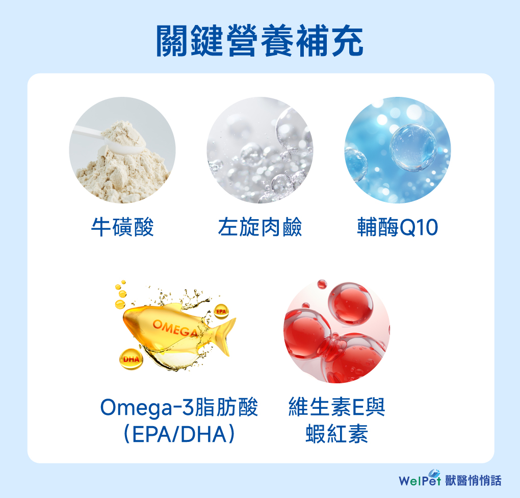 A:可以,尤其是高風險品種、年紀較大、活動量下降或體重過重的毛孩。適度補充牛磺酸、左旋肉鹼或 Omega-3 能在心臟壓力提升前提供保護。然而,保健品不能取代定期檢查,如果毛孩開始出現異常呼吸、咳嗽或疲倦,仍需優先接受獸醫評估。