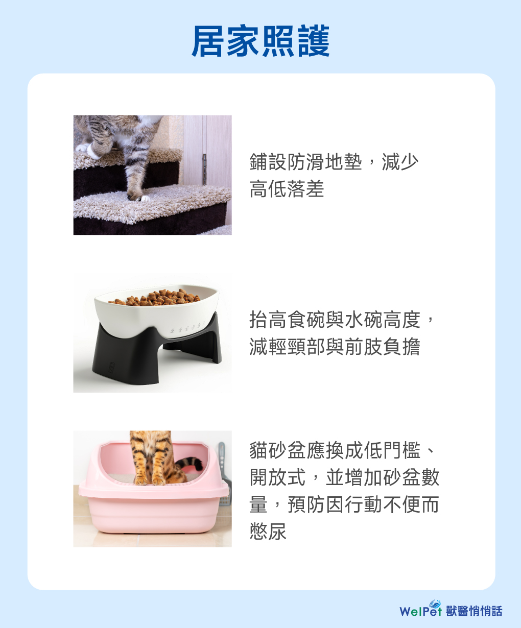 - 預防計畫: 保持理想體重,鋪設寵物止滑墊,並增設毛孩階梯或斜坡。